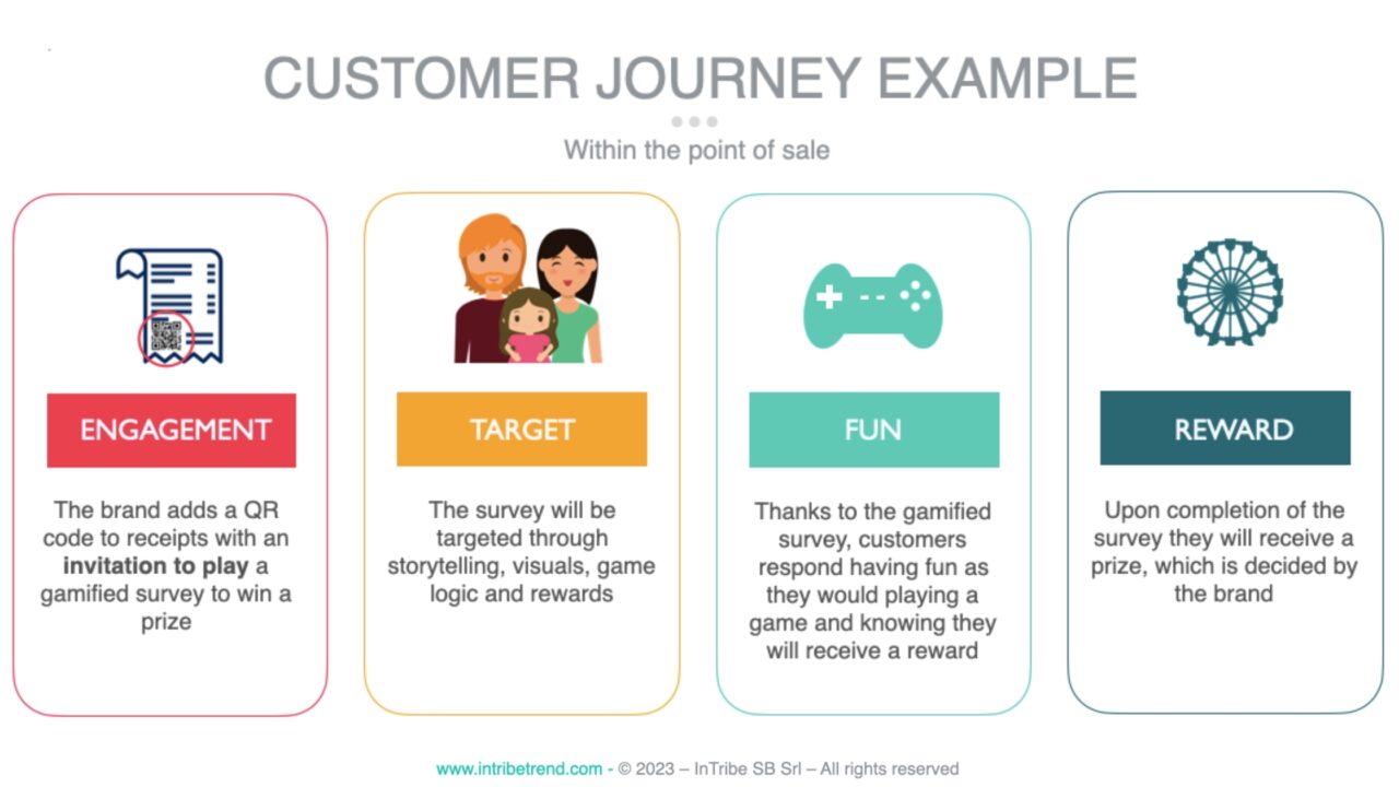 Gamified surveys can be implemented at points of sale, through your products, and within the workplace (physical and virtual).