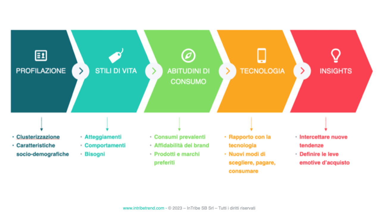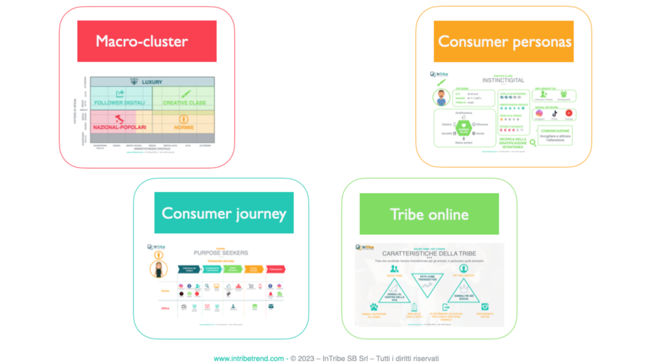 - Consumer personas, ovvero gli archetipi che evidenziano in modo dettagliato attitudini, valori, stili di vita, abitudini d’acquisto e molto altro